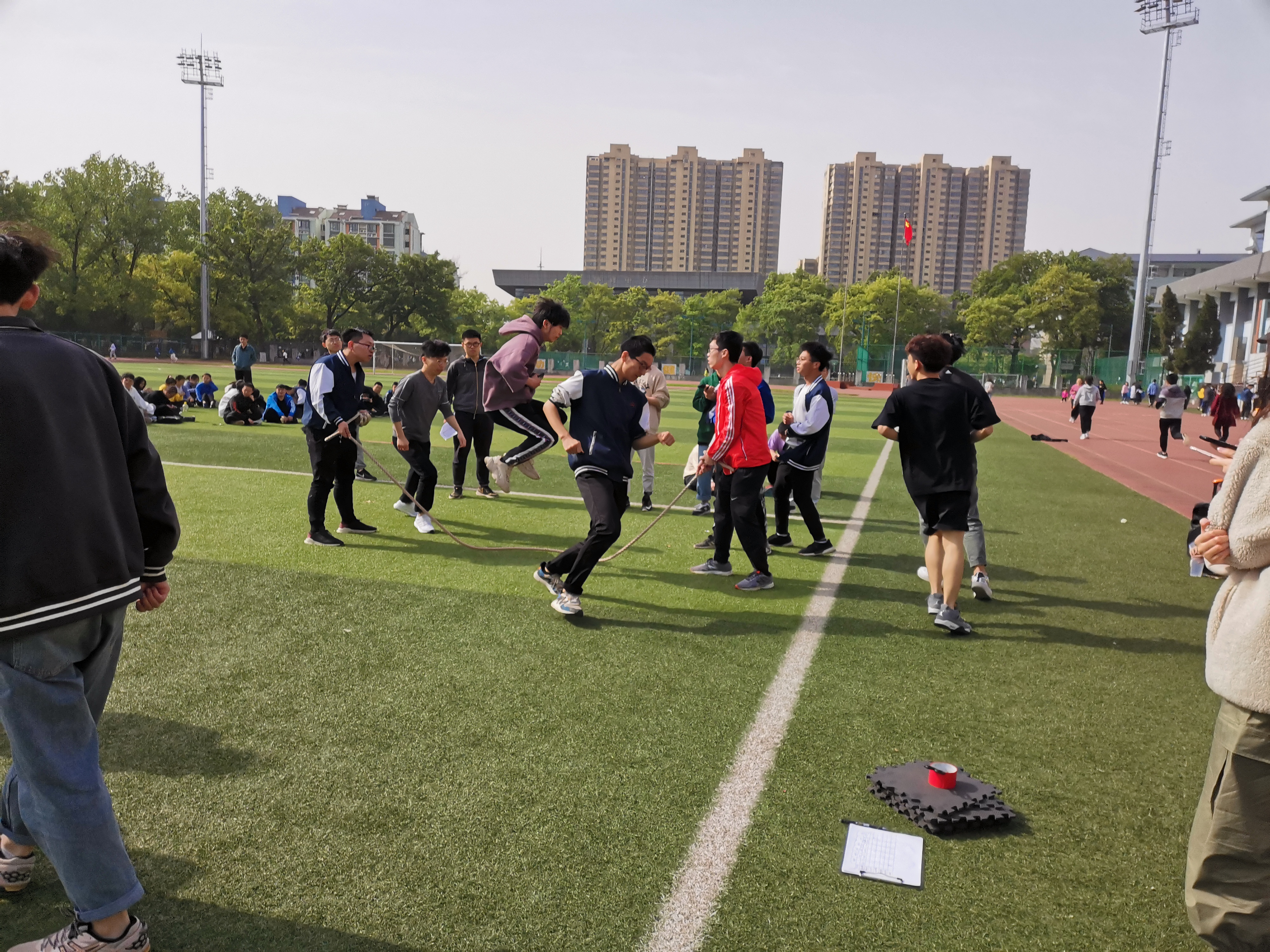 猛龙过江项目即跳长绳,同学们很熟悉,每个班级的配合都十分默契。齐心协力项目也叫8人9足,难度很大,对同学们之间的默契和配合要求很高,刚开始各个班级都遇到了不小的困难,慢慢熟悉后大家步伐逐渐整齐一致。