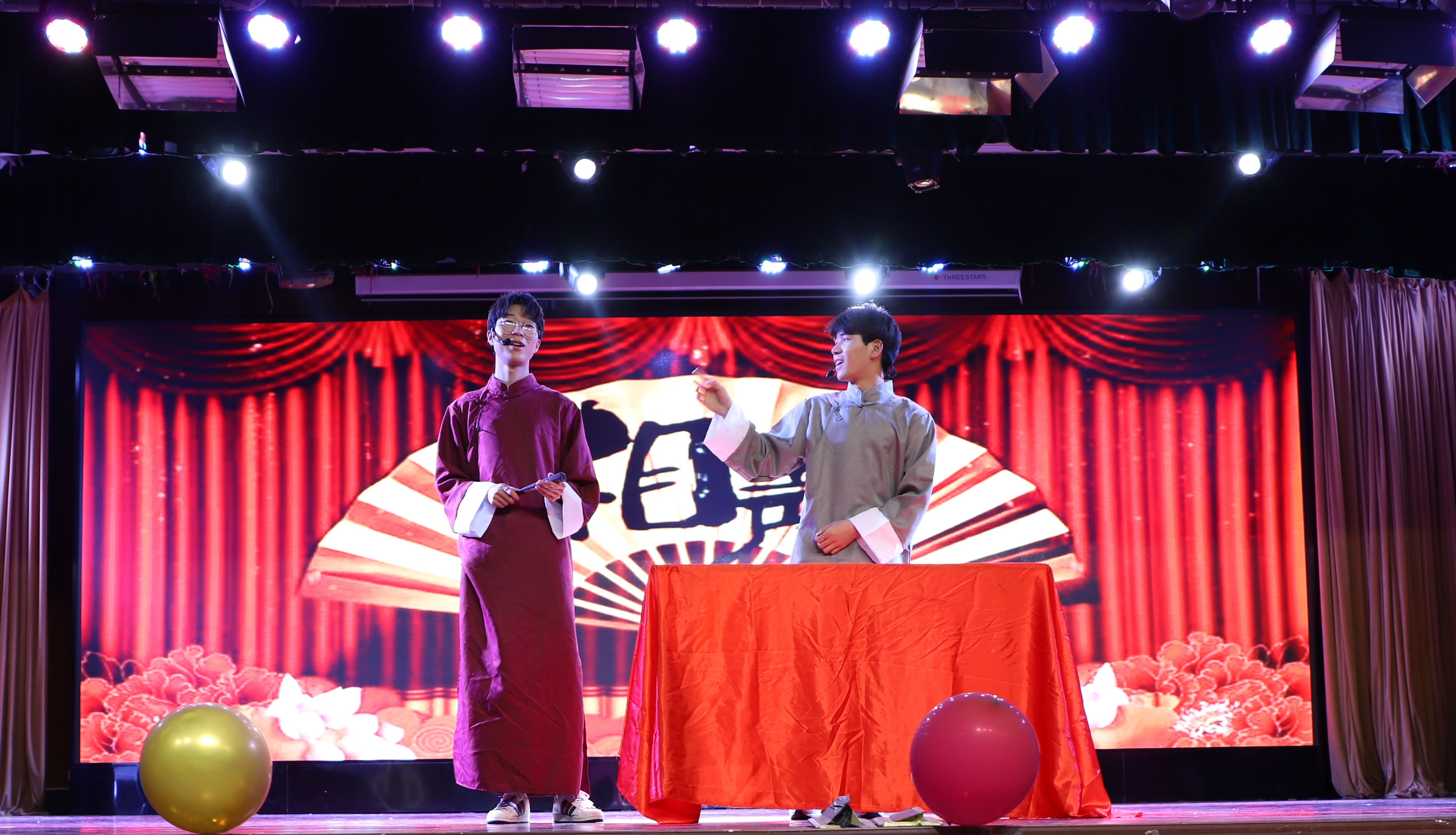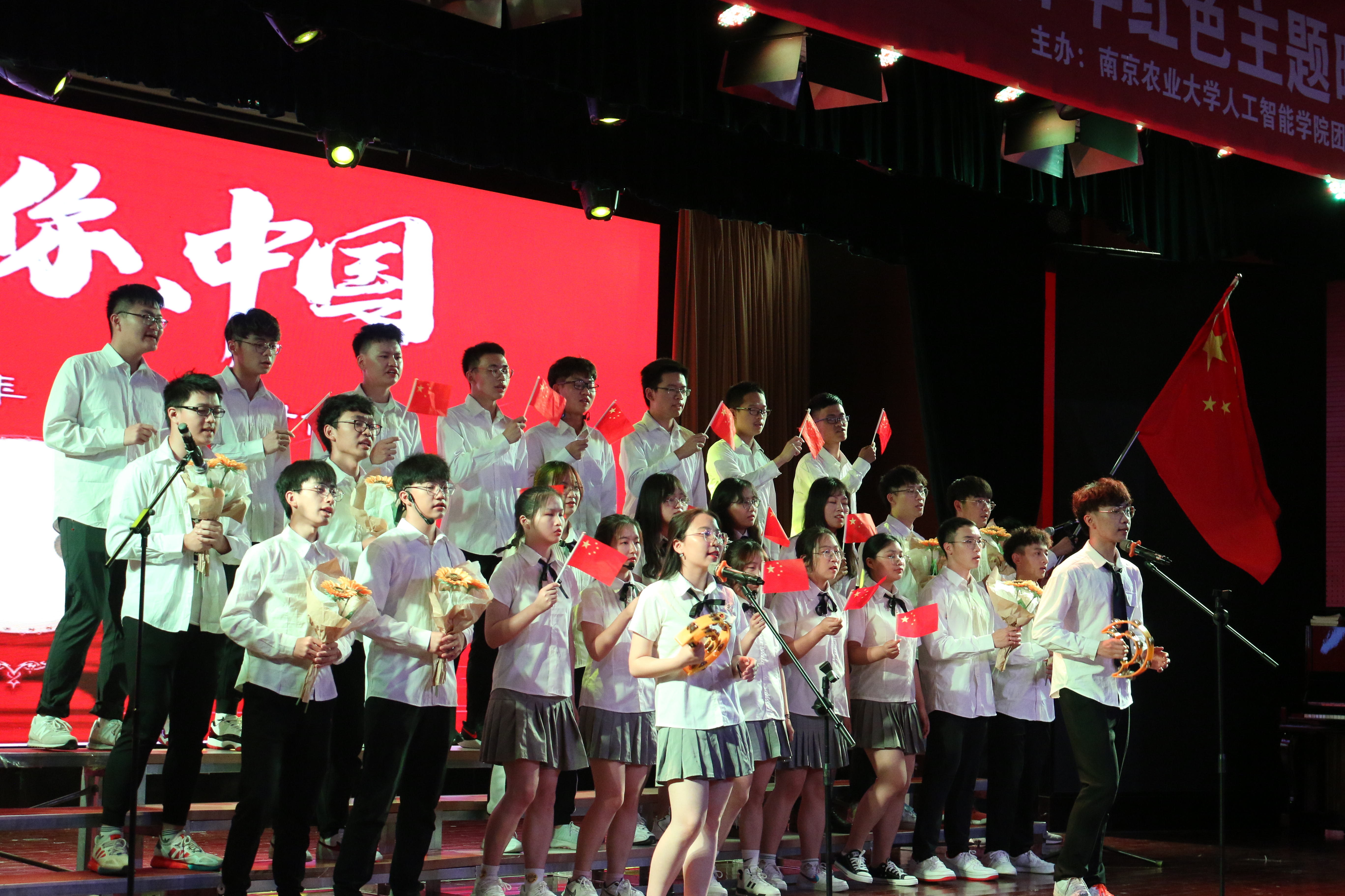 第一篇章“红旗飘飘党心聚”。晚会在电子信息类2009/10班带来的合唱《少年中国说》中拉开了序幕。学生将铿锵有力的歌唱与招式齐全的军体拳相结合,形式新颖,震撼力强。随后,人工智能201班演绎小品《穿越百年的工人光辉》,带我们再一次感受了工人阶级的强大。自动191/2班紧抓当下热点,用舞台剧的方式上演了《觉醒年代》。演员们对角色有深入的思考,现场表现力强,中英文流畅的表演引来阵阵掌声。同时,为激励全体同学全面发展,第一篇章的最后进行了“AI之星”的颁奖仪式,希望他们能再接再厉,以高度的责任感和强烈的使命感,为建设农业特色世界一流大学贡献自己的青春力量。