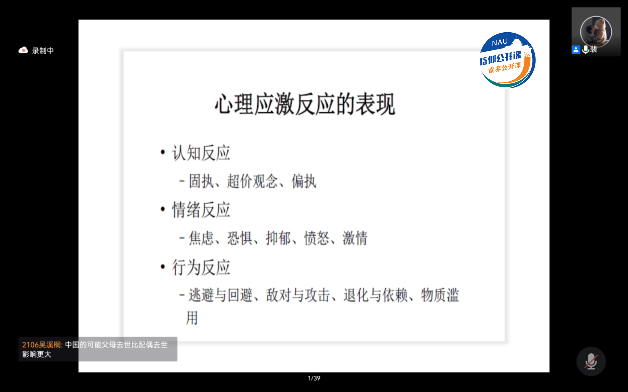 活动开始,裴教授从面对大学开学的压力以及如何看待压力入手,着重讨论了压力对心理健康的影响。其次,不断通过对具体事件的分析以及压力的相关研究,向同学们阐述了压力的类型以及产生的原因。同时解释了由于压力所产生的一些行为反应:例如压力心理对健康方面的影响。同学们也在评论区积极回应教授,互相探讨自身的压力问题。最后,裴教授从心理学的角度介绍了多种方式以应对不同的压力,为提出问题的同学们解答了疑惑。至此,本次讲座圆满结束。