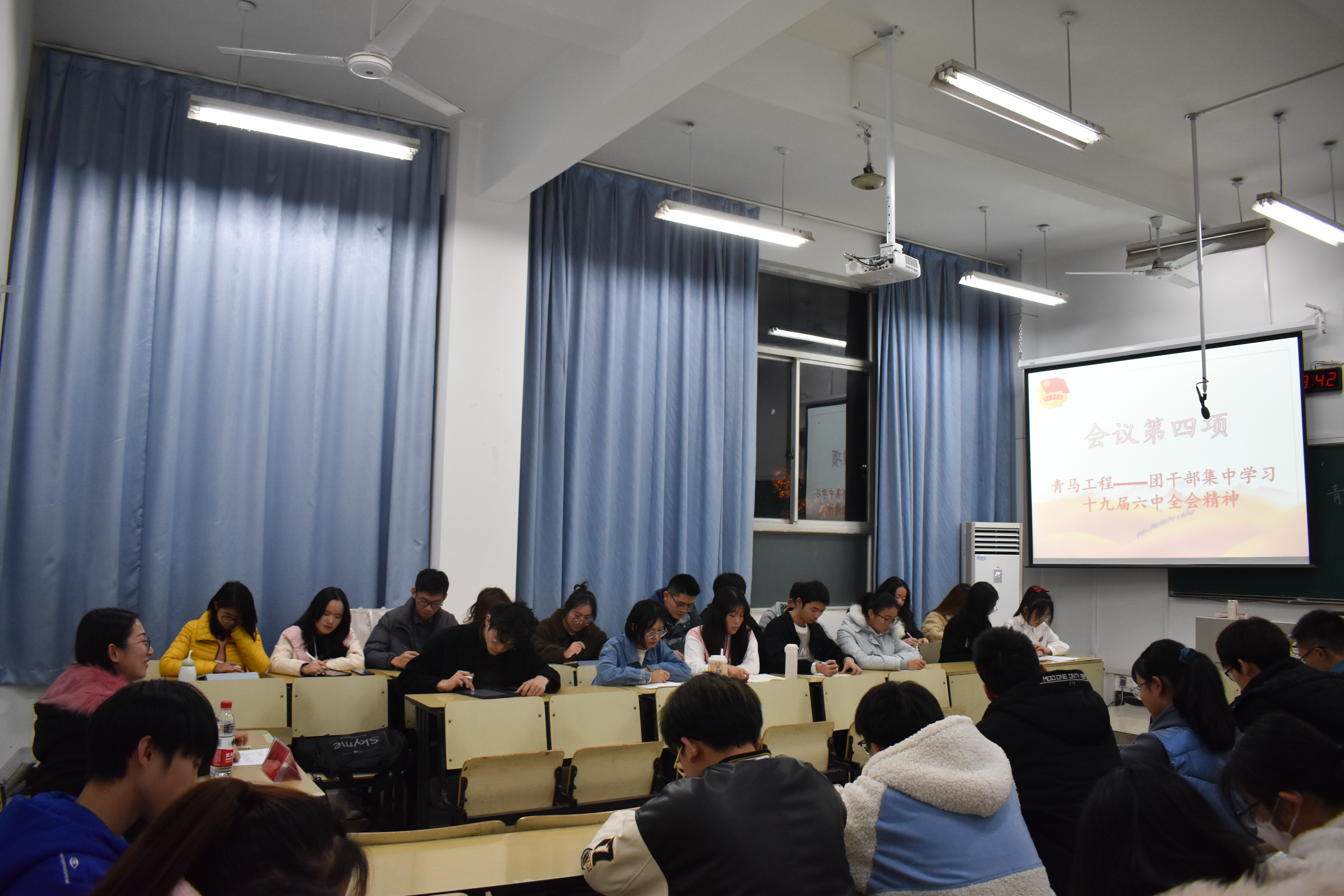 最后,团干部集中学习十九届六中全会精神。会上重点学习了《中国共产党第十九届中央委员会第六次全体会议公报》。在场同学认真学习领会全会精神,积极互动,形成热学、热议全会精神的浓厚氛围。最后,魏宇宁鼓励同学们要结合实际,不断学习贯彻十九届六中全会精神,并在以后的学习生活中,肩负历史使命,坚定前进方向,立大志、明大德、成大才、担大任,努力成为堪当民族复兴大任的时代新人,让青春在不懈奋斗中绽放绚丽之花。