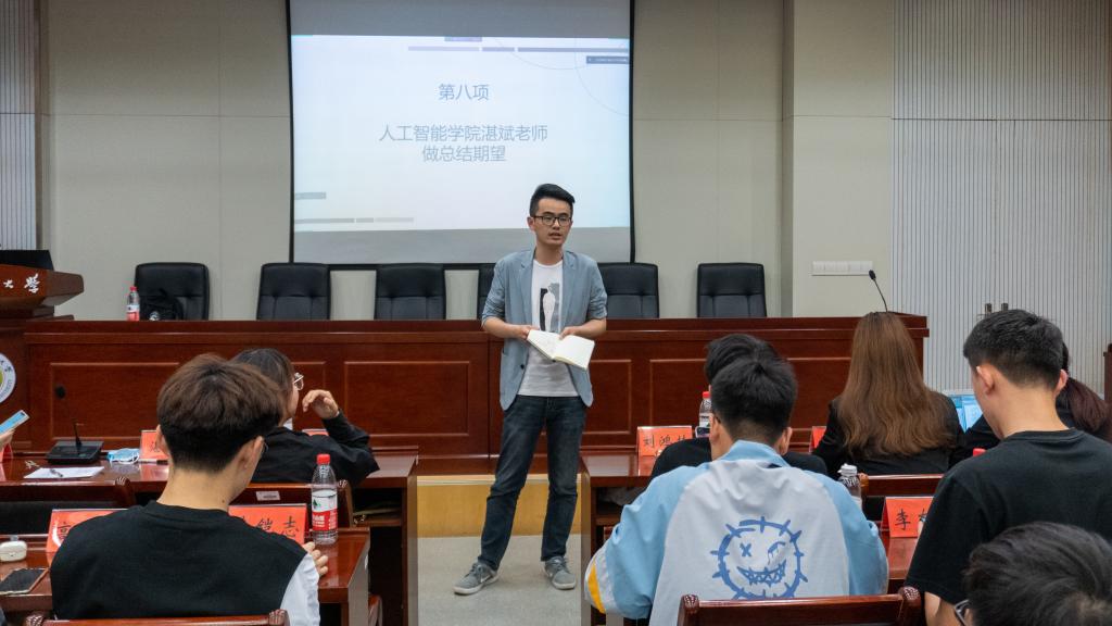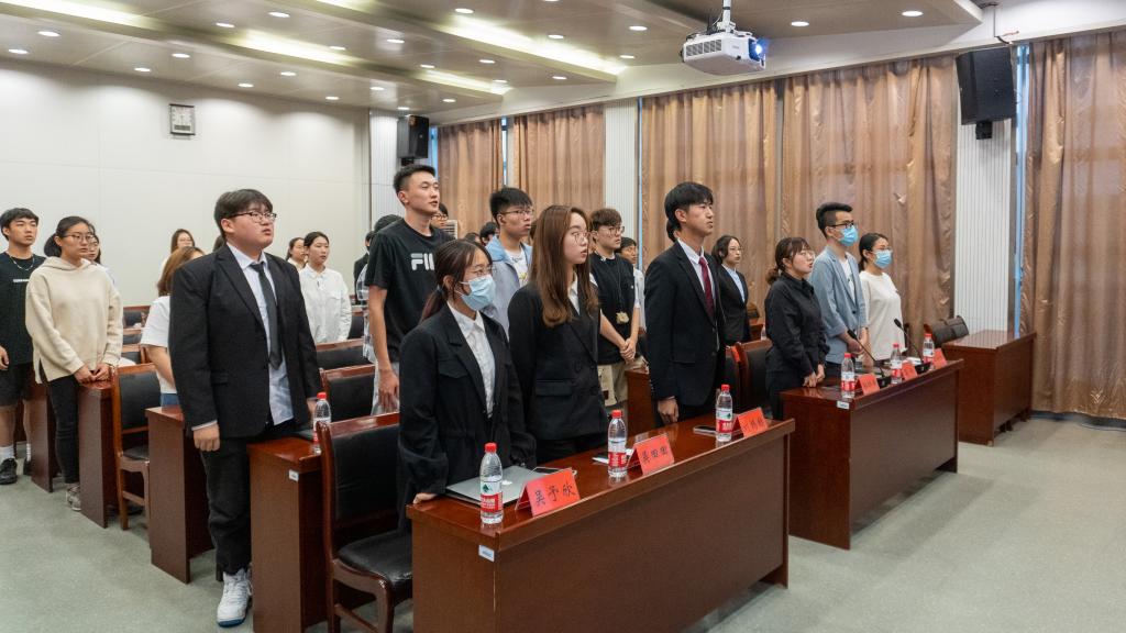 全体成员起立,奏唱国歌,在庄严的国歌声中,换届大会正式开始。院分党校秘书长刘鸿赫、学生团委副书记吴田田、全媒体中心主任李知鸿、AI工坊主席王茜格分别作2021-2022学年度工作总结。汇报完毕后,主持人宣读第三届学生组织换届评选方法及学生组织主席团候选名单。随后,十位候选人依次进行竞选演讲,评委老师进行提问和点评。候选人结合各自的实践经历、所获成绩和性格特点,分别就对各自部门的认识,在过去工作中取得的成绩,以及对未来工作的展望等方面做出了汇报,努力争取每一票。秉持“公平、公正、公开、择优”的原则,换届领导小组成员及各班学生代表慎重投出自己的一票,现场选举产生新一届主席团成员。最终王楚涵、薛志强、梅秋怡、简汇佳、周新越、周佳怡、南靖妍、刘雅彬获得票数前八名当选主席团成员。大会的最后,湛斌进行总结,他首先肯定并感谢了上一届学生组织成员出色的工作,同时也对新一届学生干部提出了更高的期望,希望在今后的工作中,团学干部能以身作则,求真务实,做学生中的表率,努力提高自身协调、沟通、应变能力,争做优秀学生干部。最后,大会在校歌声中圆满结束。