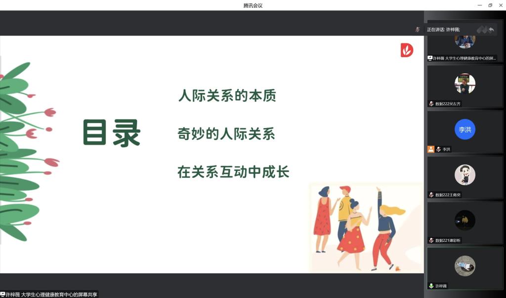 讲座伊始,许梓薇老师借助书籍《被讨厌的勇气》引出对人际关系的探讨,围绕“人际关系的本质”、“奇妙的人际关系”、“在关系互动中成长”三个话题层层递进,明确人际关系的定义,突出人际交往中边界感的重要性,强调人际关系对个人成长的影响。