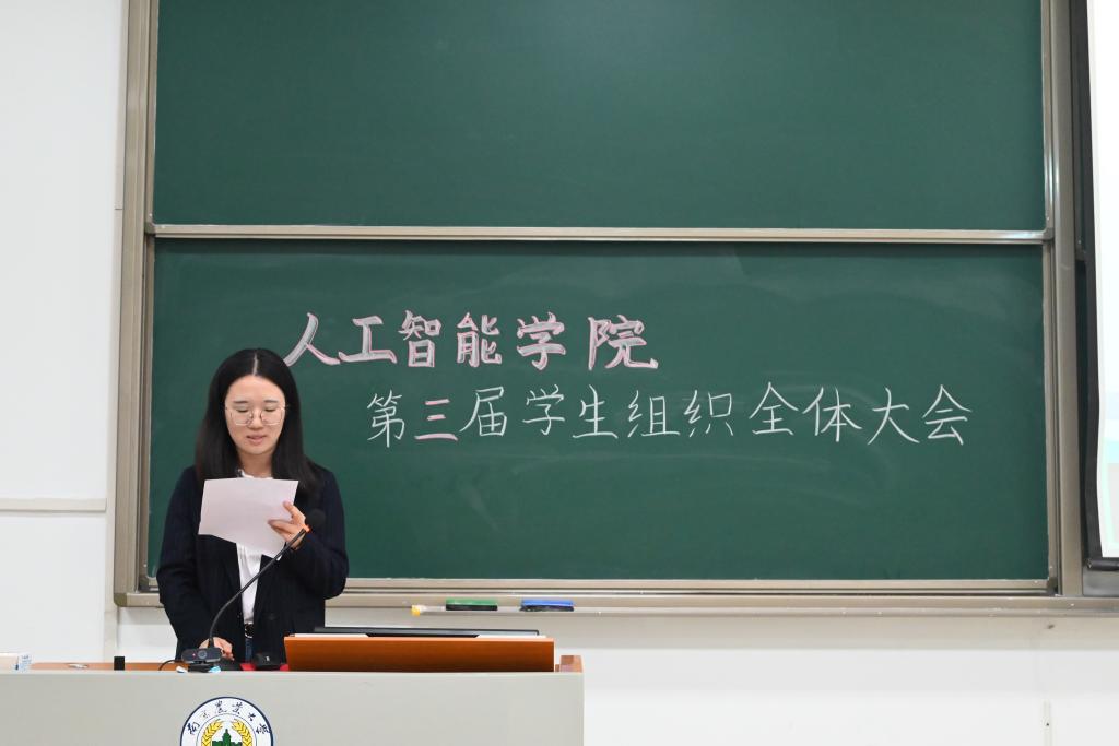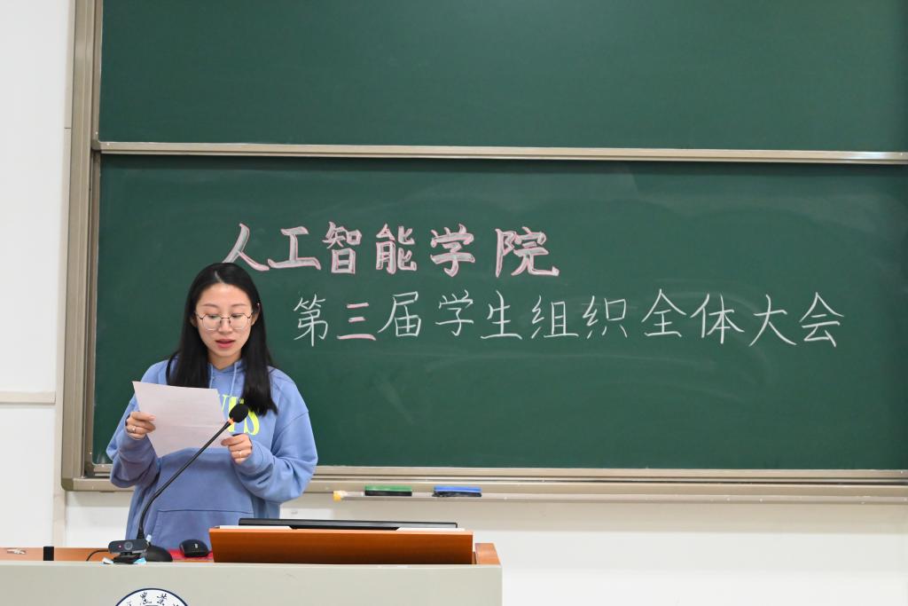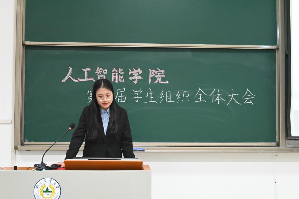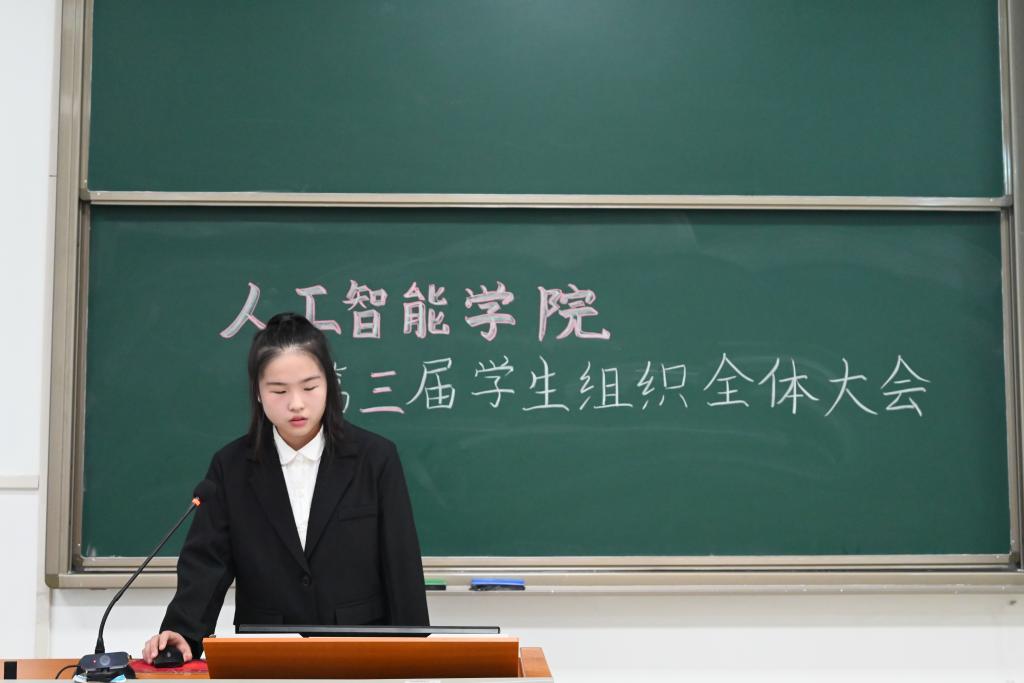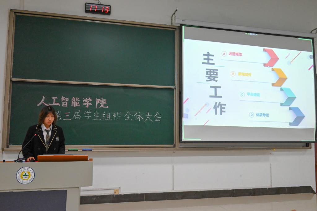 会议第二项,分党校秘书长南靖妍、学生团委副书记刘雅彬、学生会执行主席刘涛、全媒体中心主任梅秋怡、AI工坊主席王楚涵依次上台,分别介绍av影片