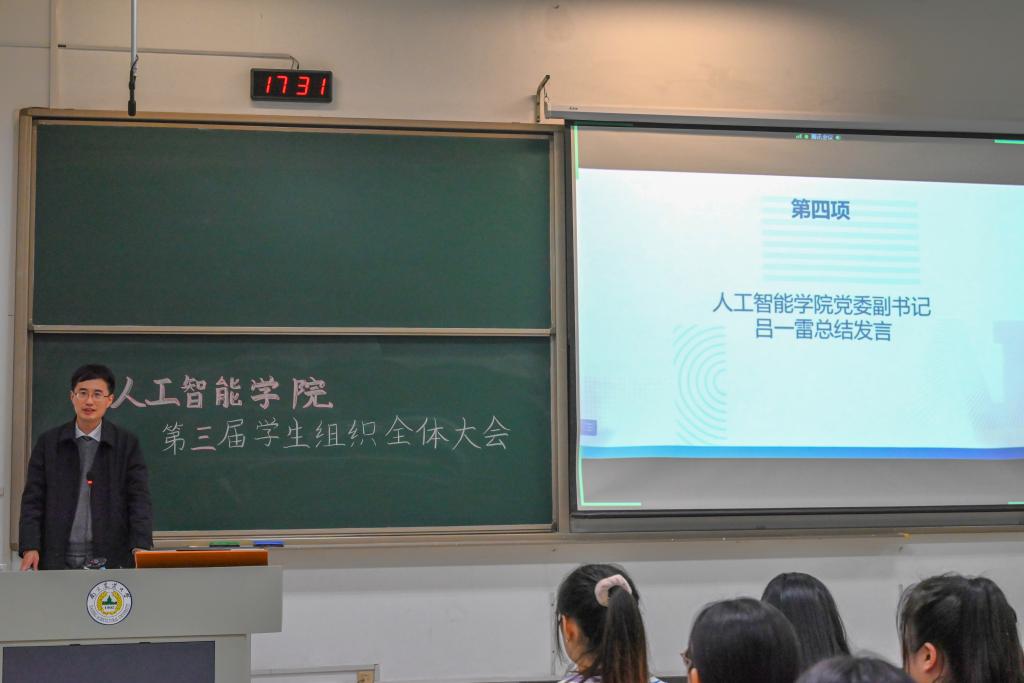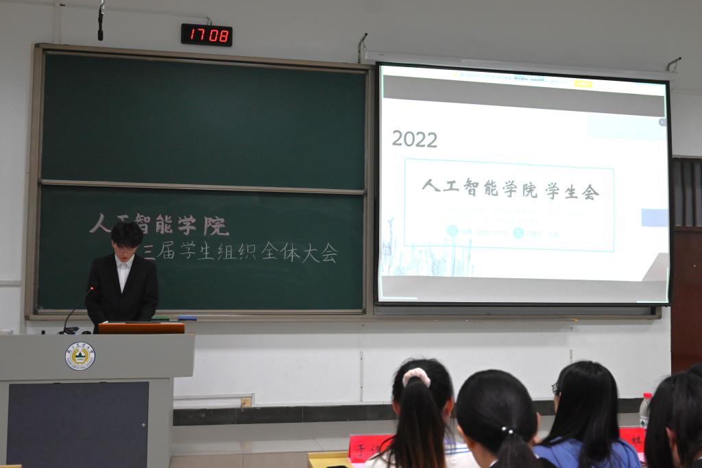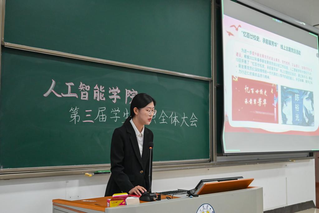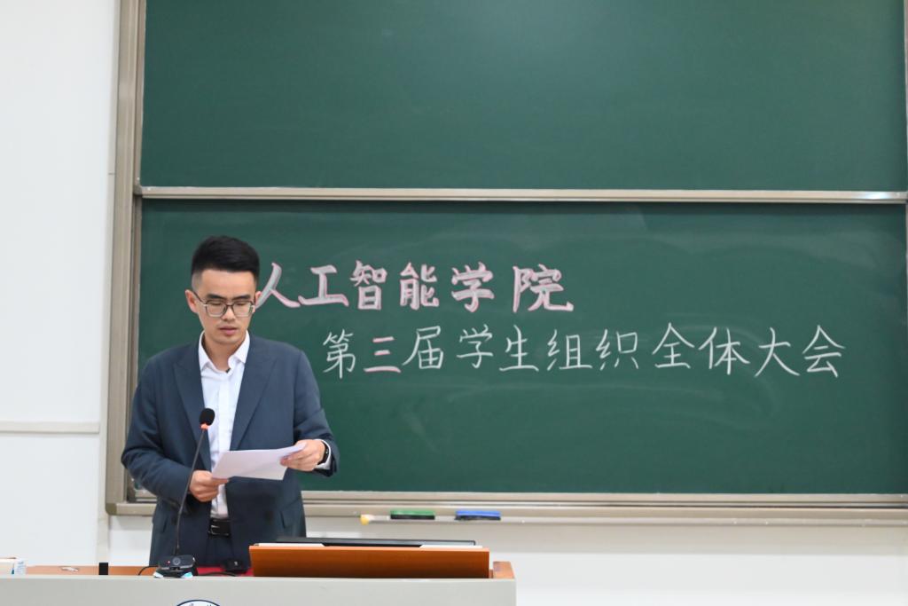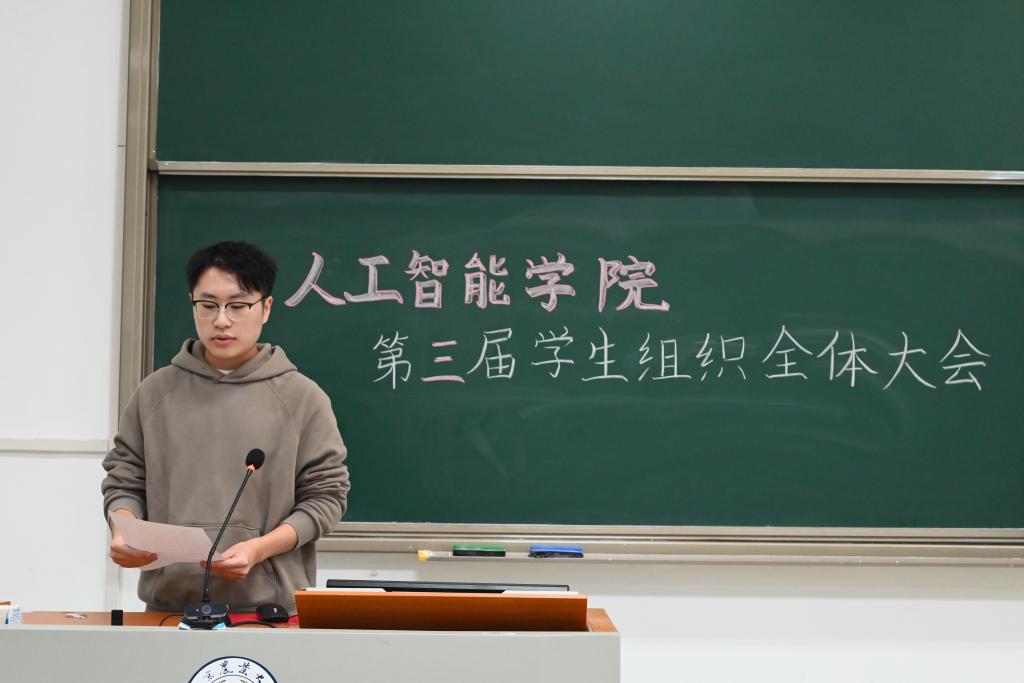 会议第二项,分党校秘书长南靖妍、学生团委副书记刘雅彬、学生会执行主席刘涛、全媒体中心主任梅秋怡、AI工坊主席王楚涵依次上台,分别介绍av影片