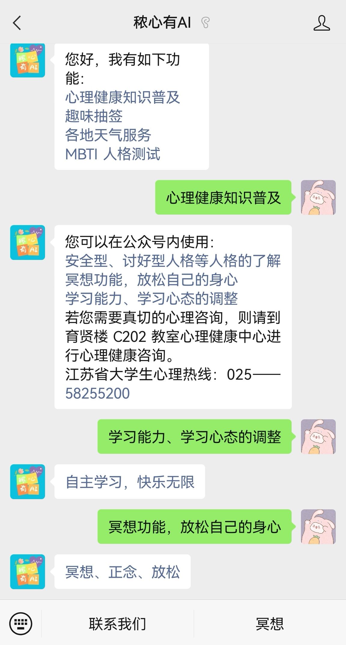团队宣传组创立了“秾心有AI”公众号,技术组接入了聊天机器人。该机器人具有心理健康知识普及、心理健康辅导、趣味抽签等特色功能,能够根据用户当前情绪展开不同内容的对话,在对话过程中讲解心理学知识,动态跟踪用户的心理波动状况,并为他们提供相应的解决方案和建议。