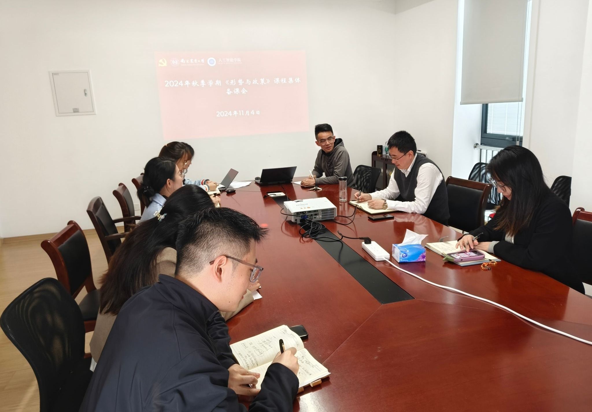 2024年秋季学期《形势与政策》课程集体备课会在12号楼A827会议室召开,承担本学期《形势与政策》课教学任务的专兼职任课教师7人参加集体备课会。
