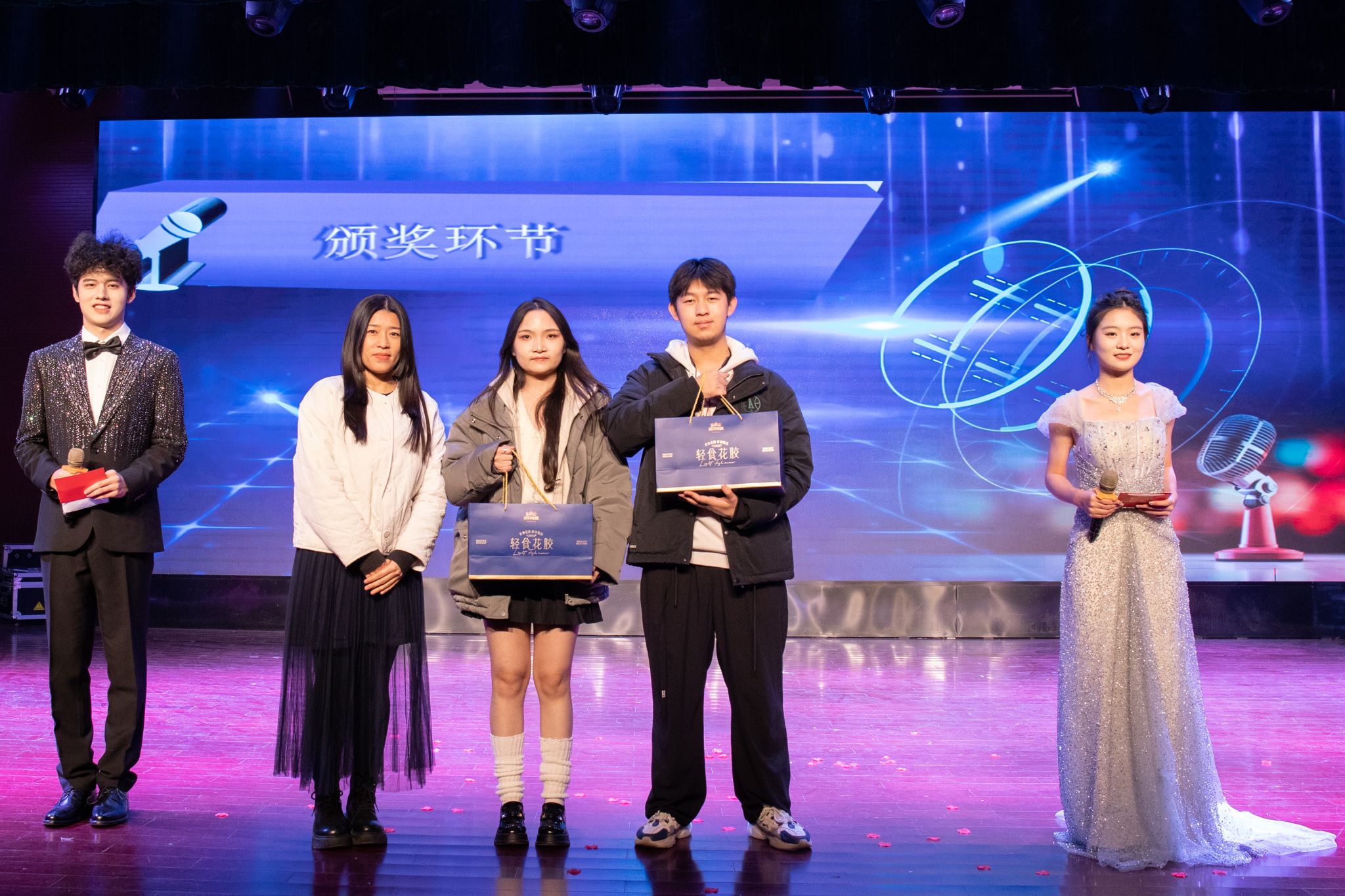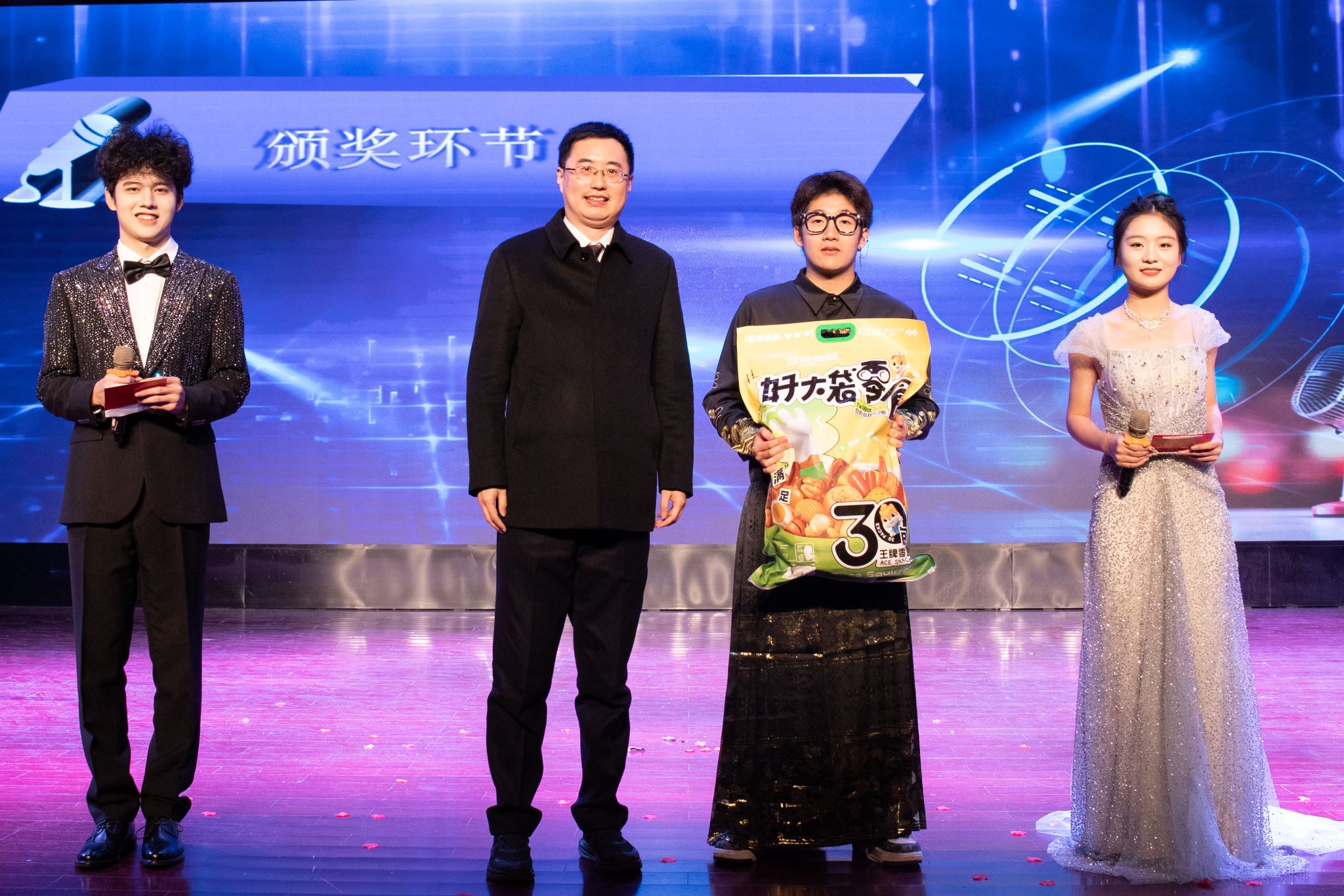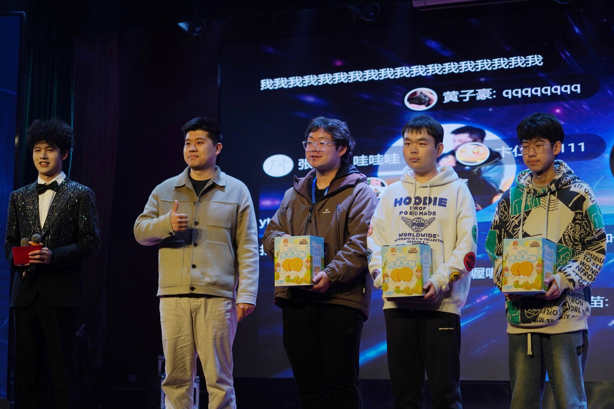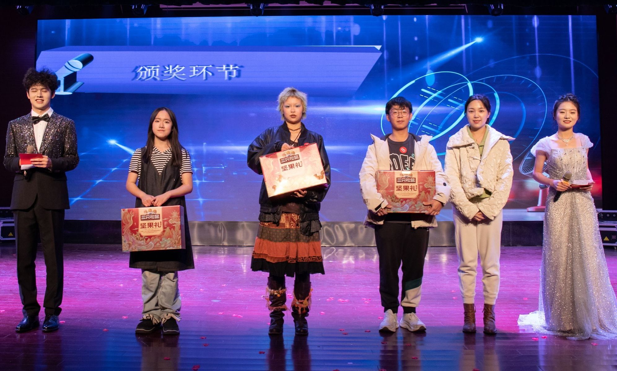 大赛的第一、二轮抽奖环节,让现场气氛逐渐升温。“三只松鼠”豪华礼包,引得众人瞩目。主持人分别邀请何旭老师、曹夜景老师上台,通过微信扫码线上滚动的方式抽取幸运儿。同学们热情爆棚,个个翘首以盼,眼神中满是紧张与期待。随着老师喊下暂停,幸运观众相继产生,欢呼声如浪潮般此起彼伏。整个抽奖过程悬念迭起,激动人心的场景,让每个同学都沉浸其中,感受着这份独特的惊喜与愉悦。