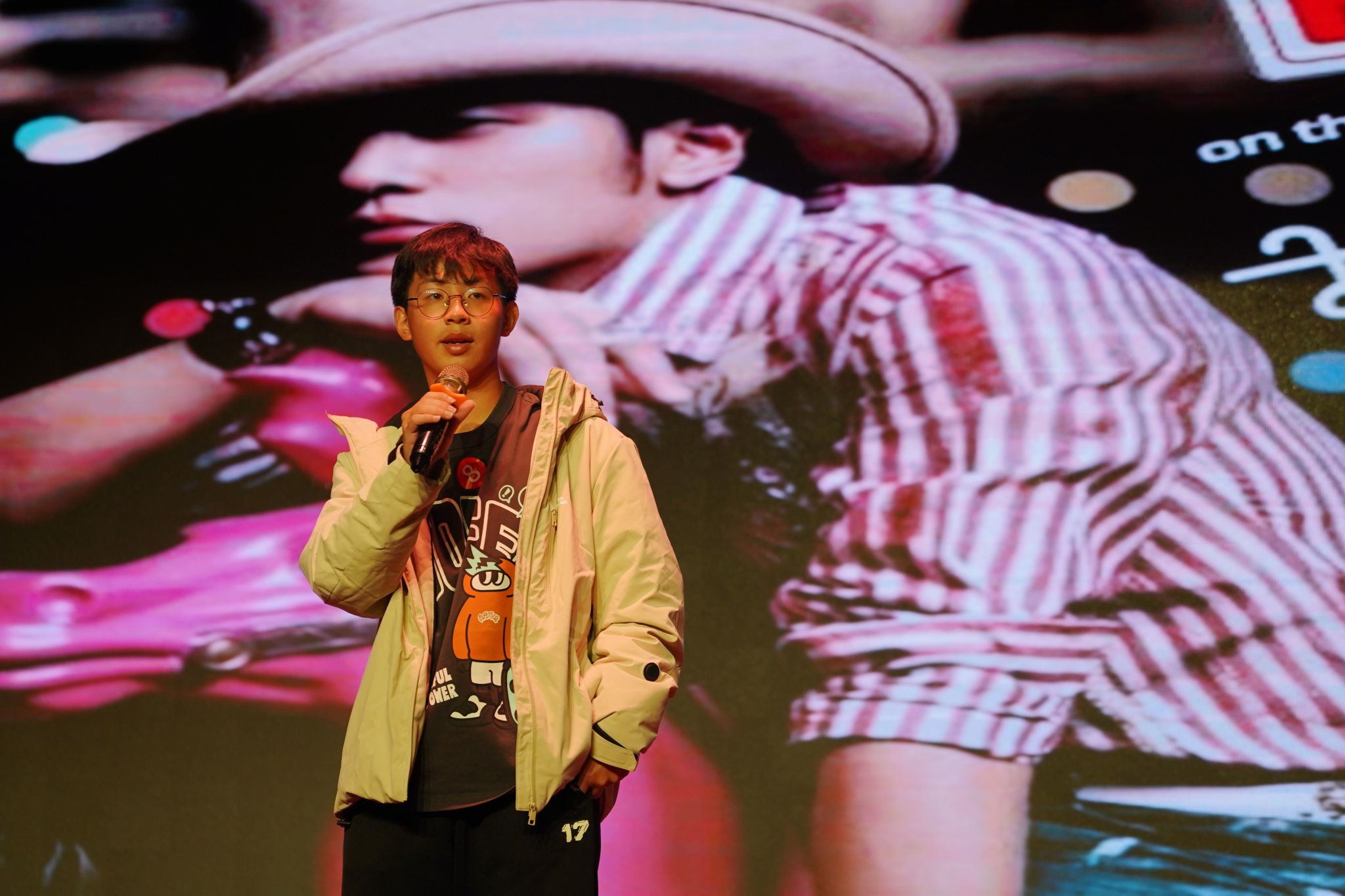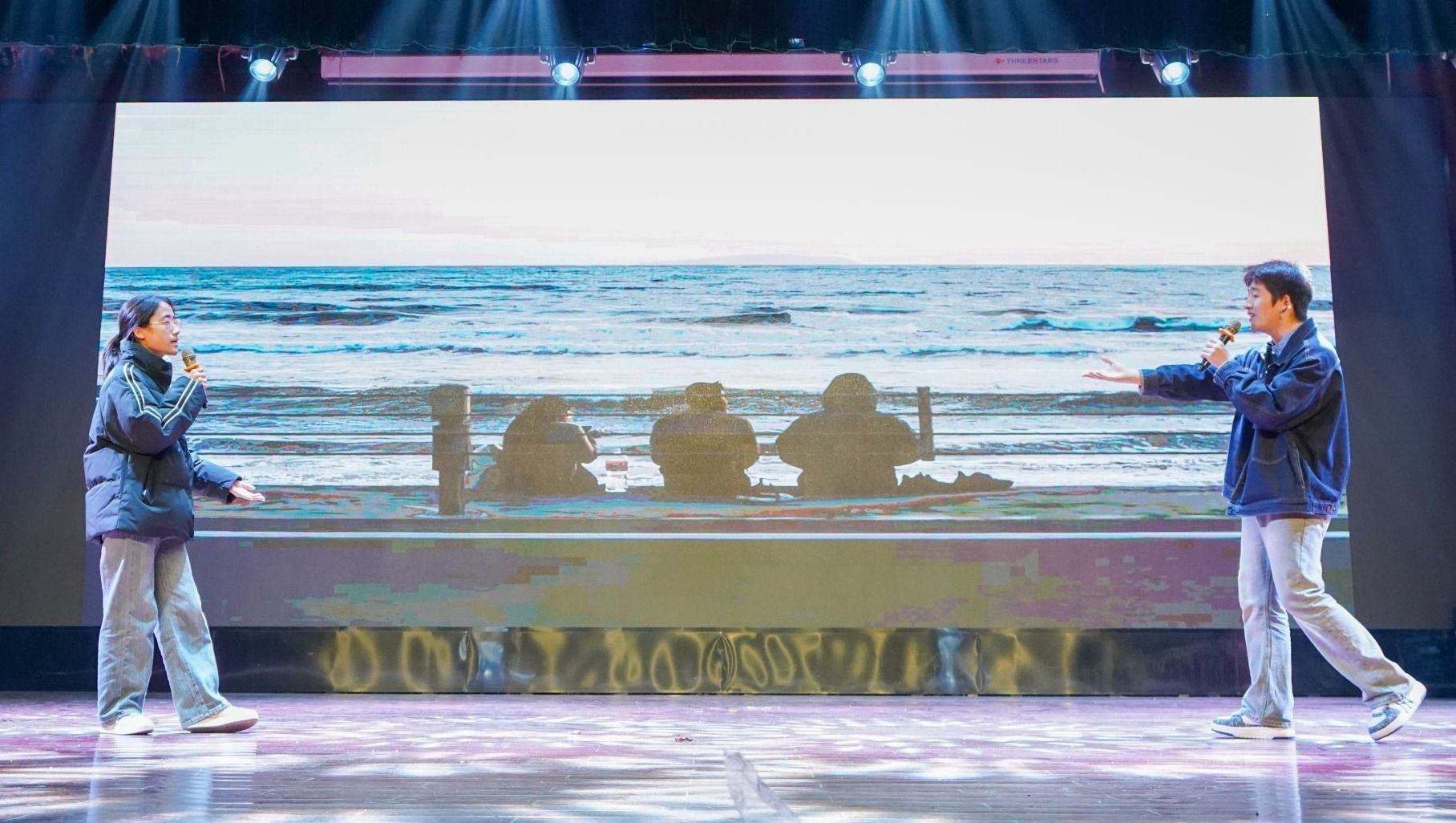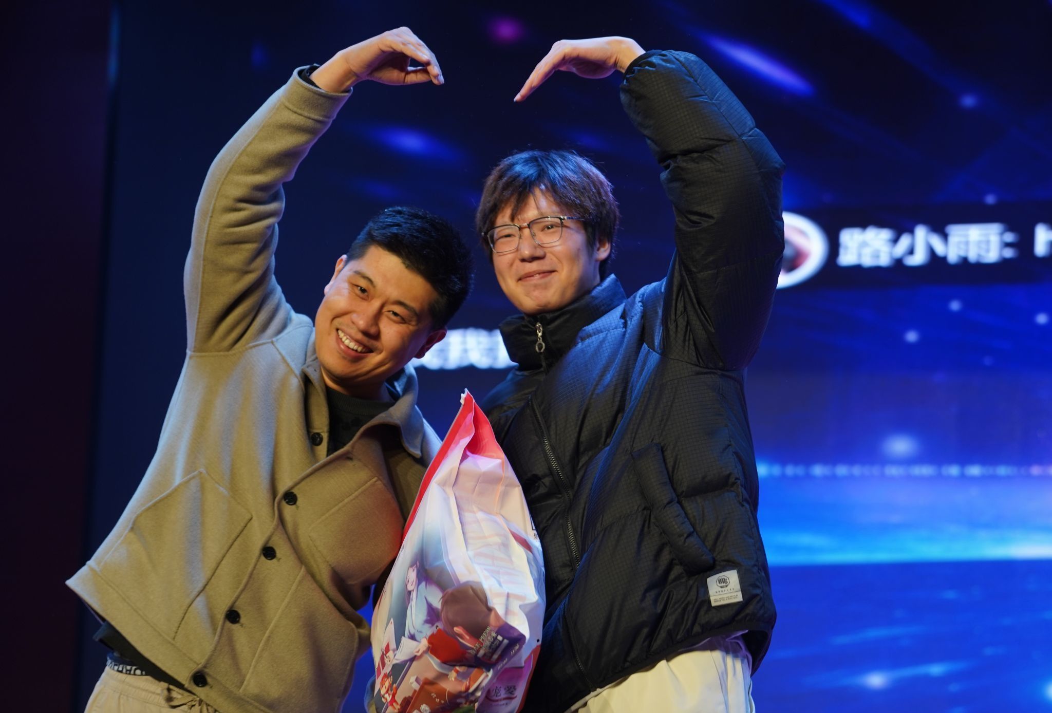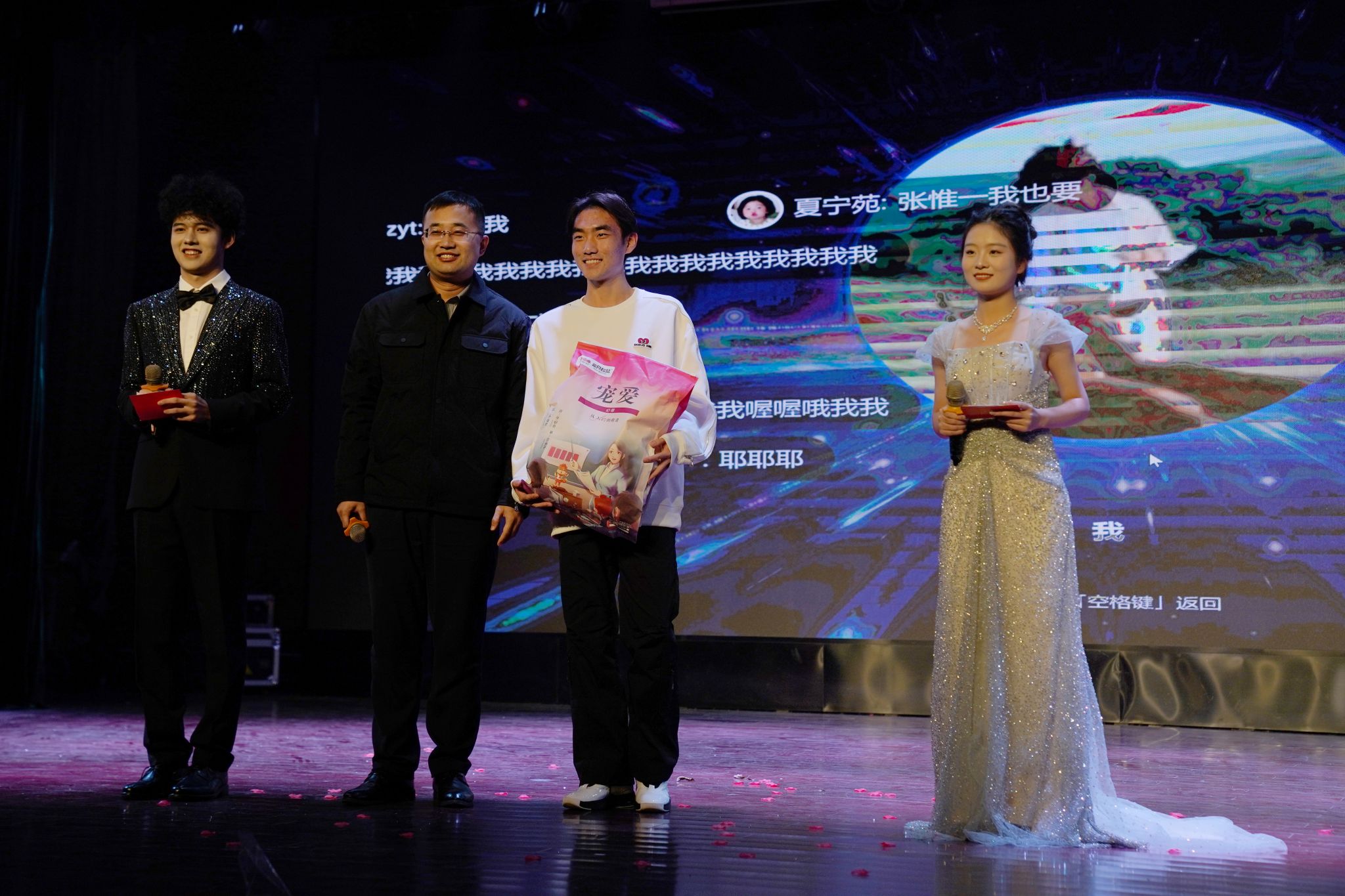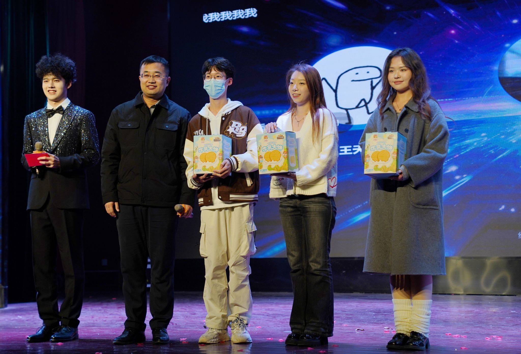 大赛的第一、二轮抽奖环节,让现场气氛逐渐升温。“三只松鼠”豪华礼包,引得众人瞩目。主持人分别邀请何旭老师、曹夜景老师上台,通过微信扫码线上滚动的方式抽取幸运儿。同学们热情爆棚,个个翘首以盼,眼神中满是紧张与期待。随着老师喊下暂停,幸运观众相继产生,欢呼声如浪潮般此起彼伏。整个抽奖过程悬念迭起,激动人心的场景,让每个同学都沉浸其中,感受着这份独特的惊喜与愉悦。