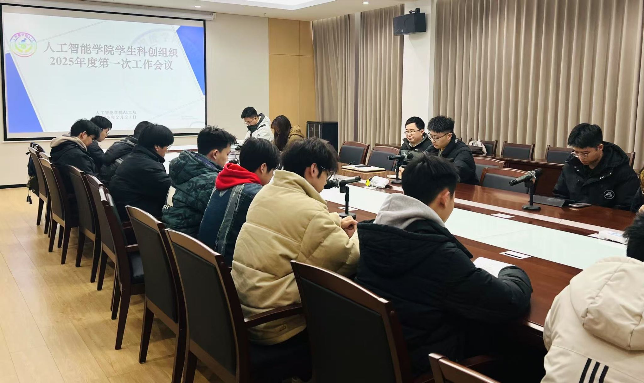 学生科创组织2025年度第一次工作会议在滨江校区学院楼A863会议室举行,学院党委副书记吕一雷、负责本科生课外科技竞赛的辅导员李洪,AI工坊主要学生干部和创新创业工作室负责人参加会议。会议由李洪主持。