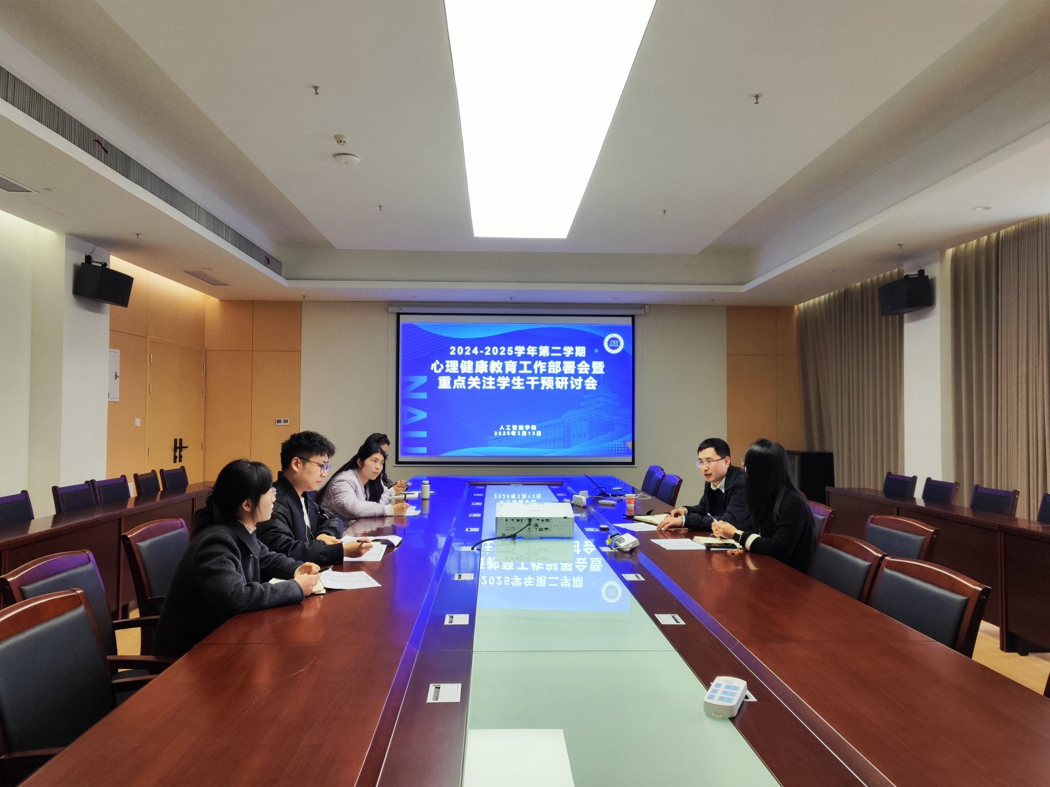 于3月13日在学院楼A863会议室召开新学期心理健康教育工作部署会暨重点关注学生干预研讨会,会议由党委副书记吕一雷主持,学院全体辅导员参加。