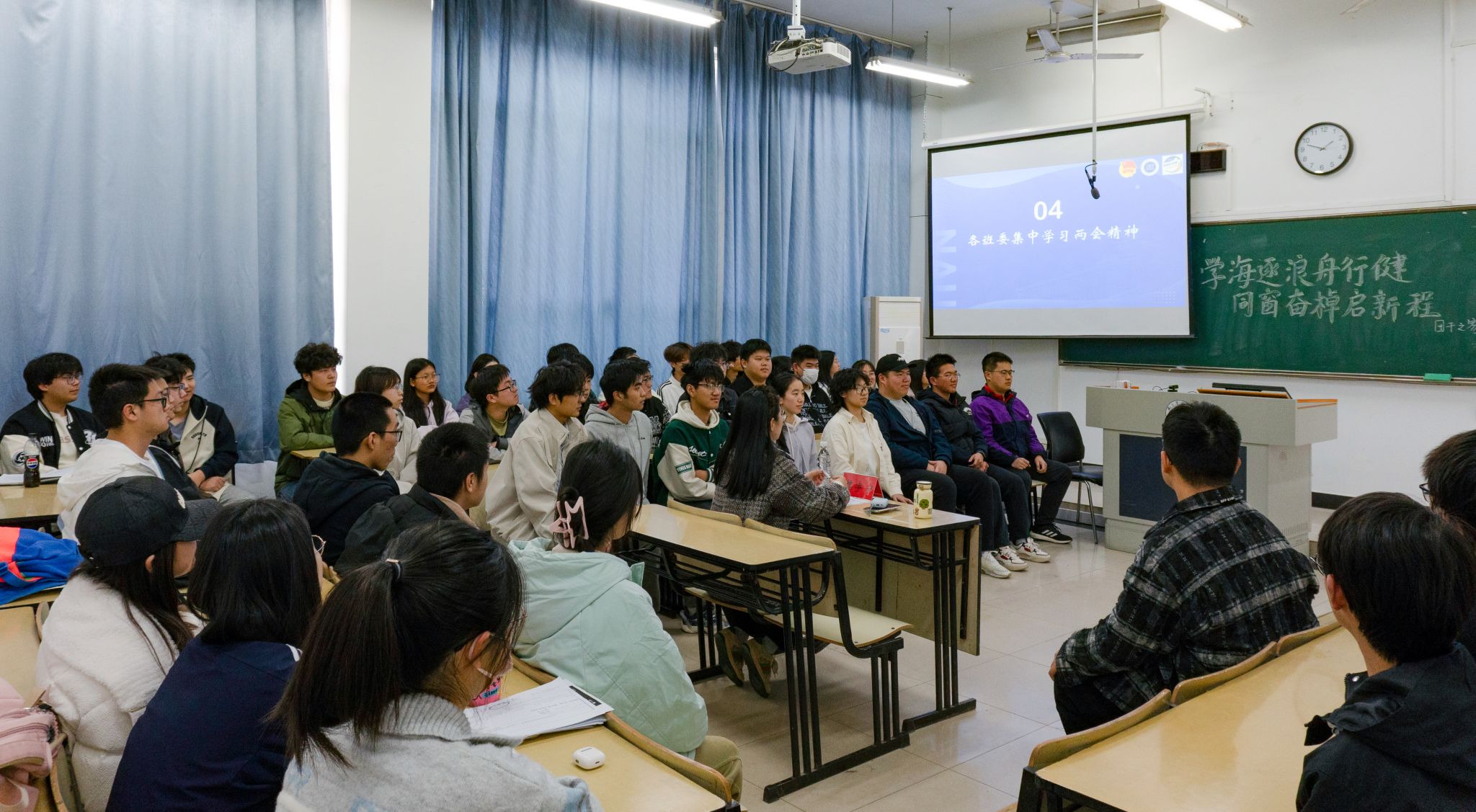 “学海逐浪舟行健,同窗奋棹启新程”团干之家主题会议在汇贤楼A107举行。学院辅导员魏宇宁、团学组织骨干及2023-2024级全体班委共计60余人齐聚一堂,共商学风建设大计。