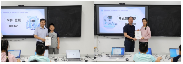 李骅书记与田永超常务副院长亲手为每位孩子颁发结营证书,并亲切俯身交流:“学习开心吗?”“以后要不要继续探索计算机世界?”温暖互动中勉励孩子们带着这份对科学的好奇,继续在生活中发现问题、解决问题,未来成为科技创新的‘生力军’”。