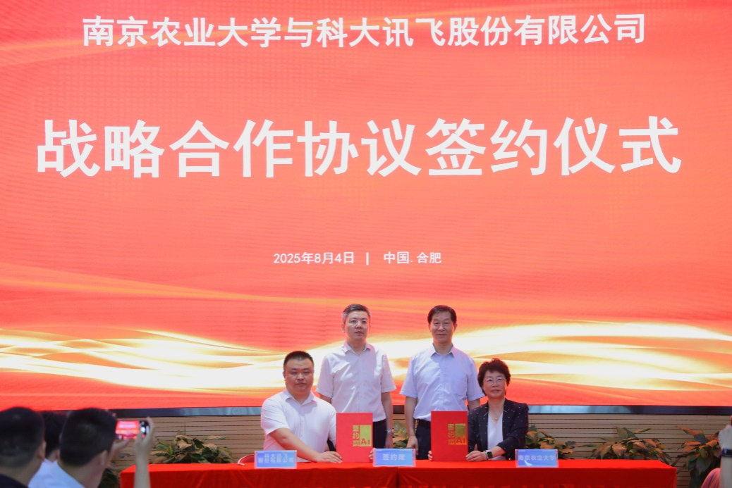 8月4日,学校与科大讯飞股份有限公司在合肥举行战略合作签约仪式。全国政协常委、教科卫体委员会副主任、民盟中央副主席、南京农业大学智慧农业研究院名誉院长曹卫星,科大讯飞副总裁、江苏大区总经理黄飞云,科大讯飞高教事业部副总经理尹明磊,学校党委常委、副校长朱艳等出席签约仪式。