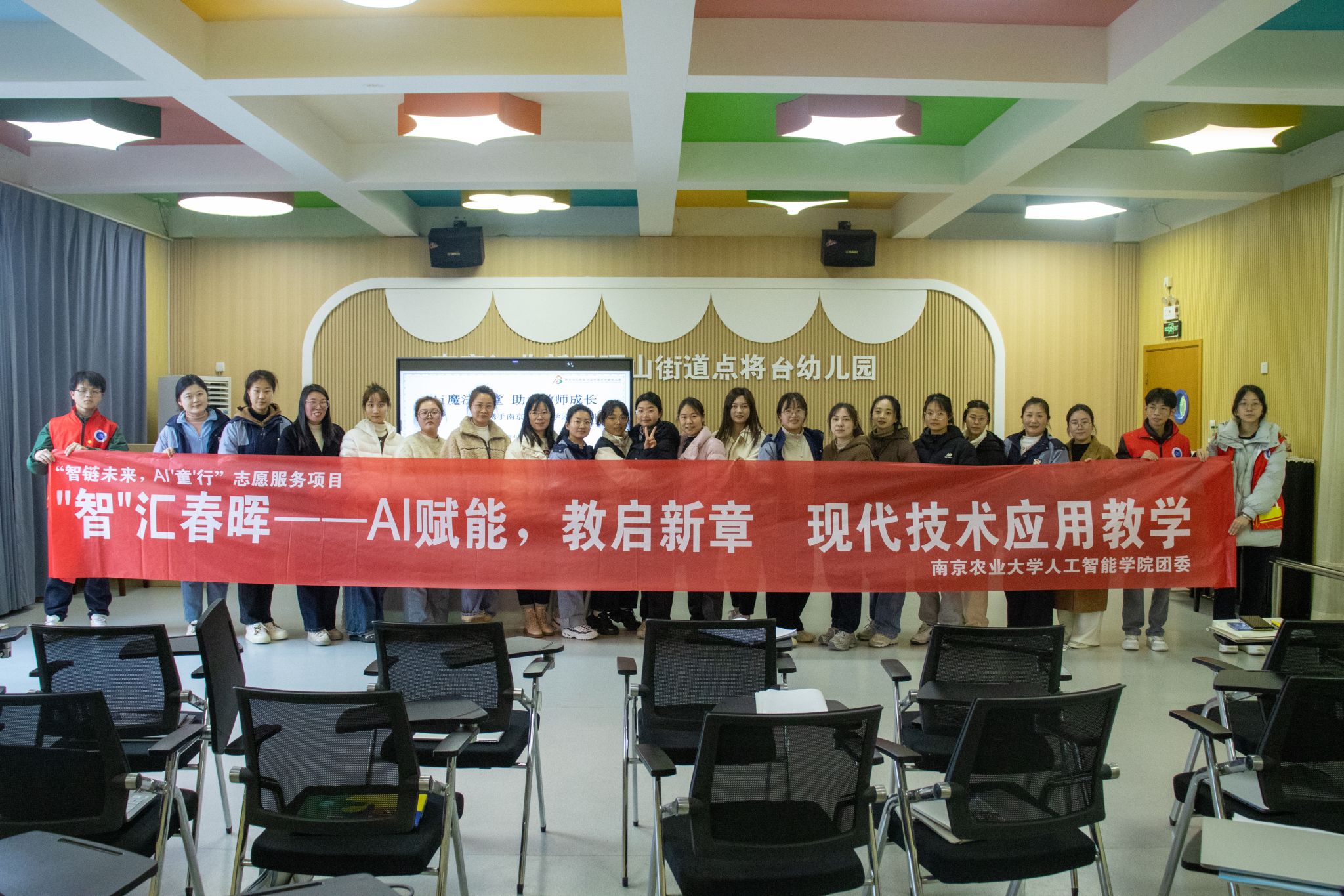 3月13日,南京农业大学av影片 开展“智汇春晖——AI赋能,教启新章”教师专项培训活动,标志着“智链未来,AI‘童’行”志愿服务项目实现服务对象由儿童向教育者的战略升级。本次活动联合南京市点将台幼儿园,聚焦人工智能技术在教学场景的深度应用,通过系统性培训20余名幼教工作者,助力传统教育模式向智慧教育转型。