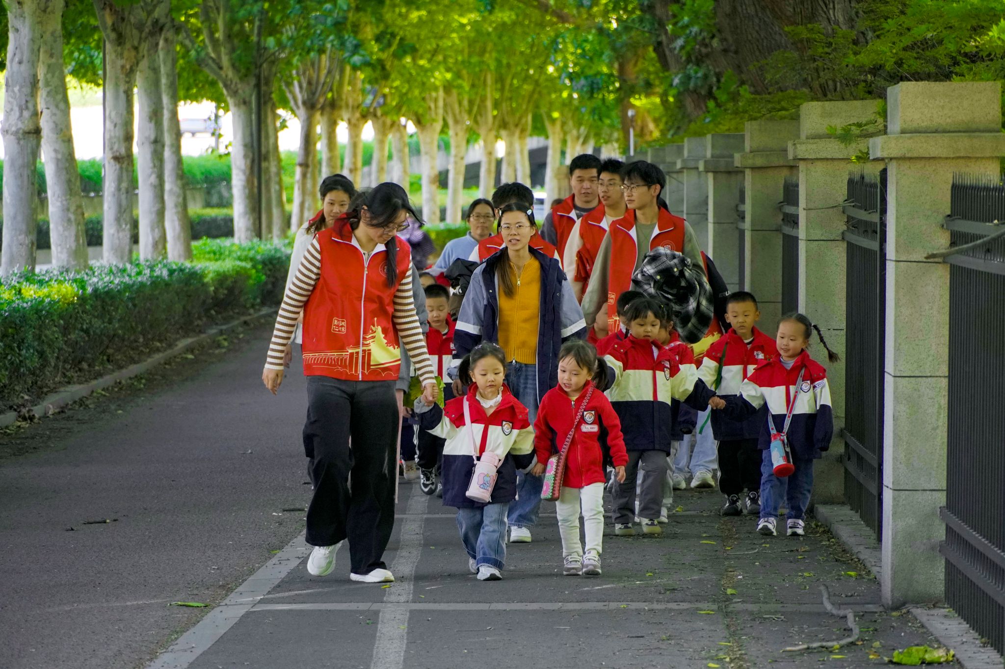 活动当日,浦口校区化身秋日童话世界。志愿者们化身“自然向导”,带领孩子们沿精心设计的实践路线漫步,孩子们时而俯身拾起银杏叶,时而驻足观察梧桐树。稚嫩的提问与清脆的笑声在校园回荡。“老师,枫叶为什么会变红呀?”“梧桐树的树杈为什么这么大?”面对孩子们的好奇心,志愿者们用生动的比喻和互动游戏,将植物生长知识融入自然观察,让科学启蒙在秋游中悄然发生。
