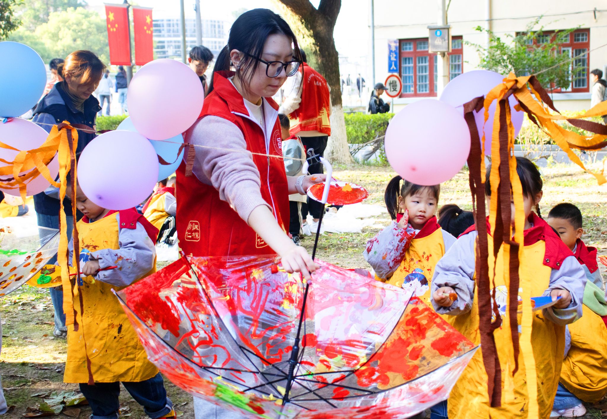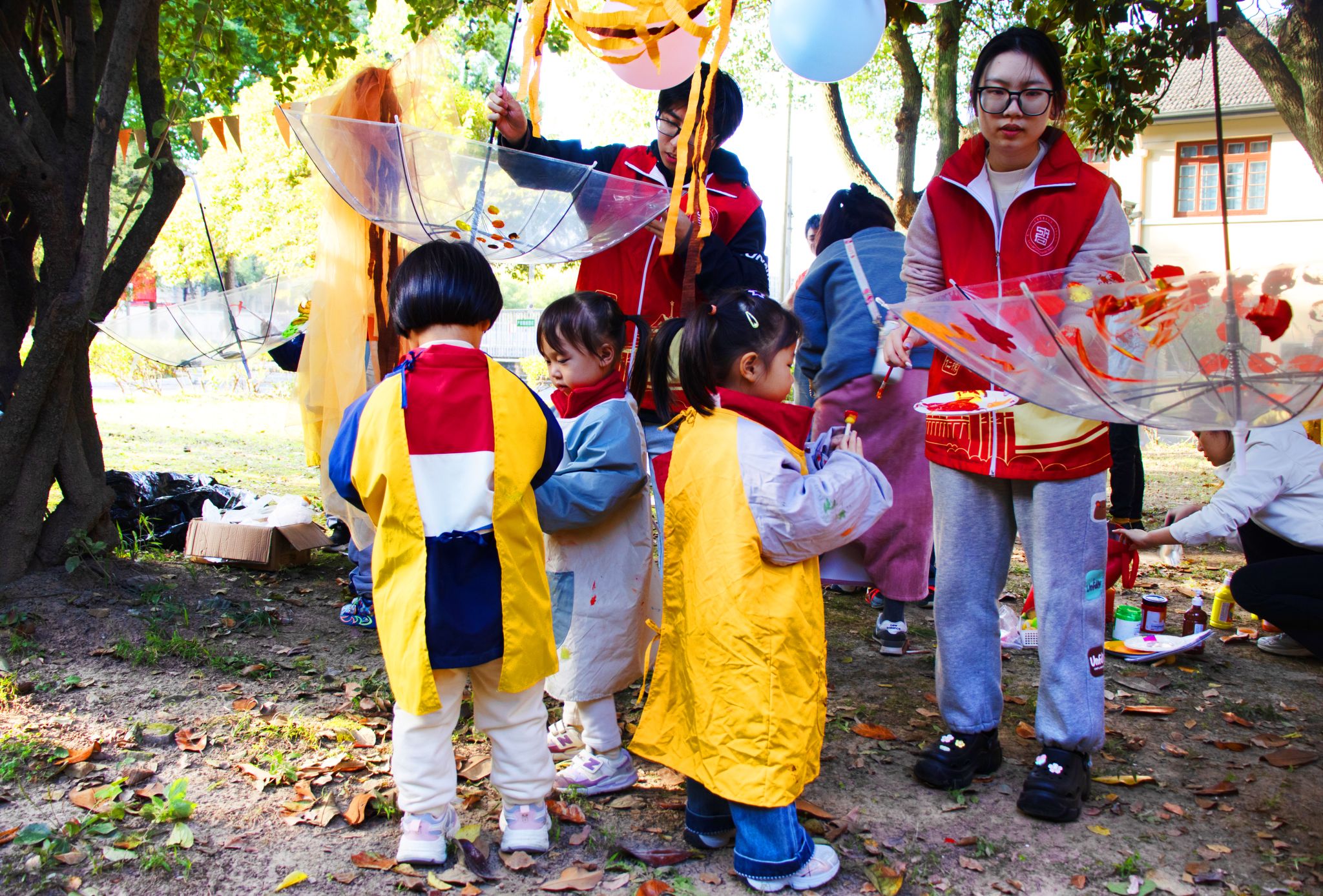 在随后的“秋叶艺术工坊”环节,勤人廊前的广场变身创意天地。志愿者们提前准备了环保雨伞、迷你帐篷、水彩颜料等材料,引导孩子们将采集的秋叶拓印、拼贴,或用画笔将秋色定格。女孩朵朵将枫叶拓印成蝴蝶翅膀,在伞面上绘出“会飞的秋天”;男孩豆豆则用落叶及颜料在帐篷上创作出充满童趣的“森林派对”。志愿者们全程一对一陪护,既守护安全又激发灵感,当孩子们举着独一无二的“秋叶伞”“童话帐篷”欢呼展示时,阳光透过彩绘伞面洒下斑斓光影,构成秋日里最动人的画面。