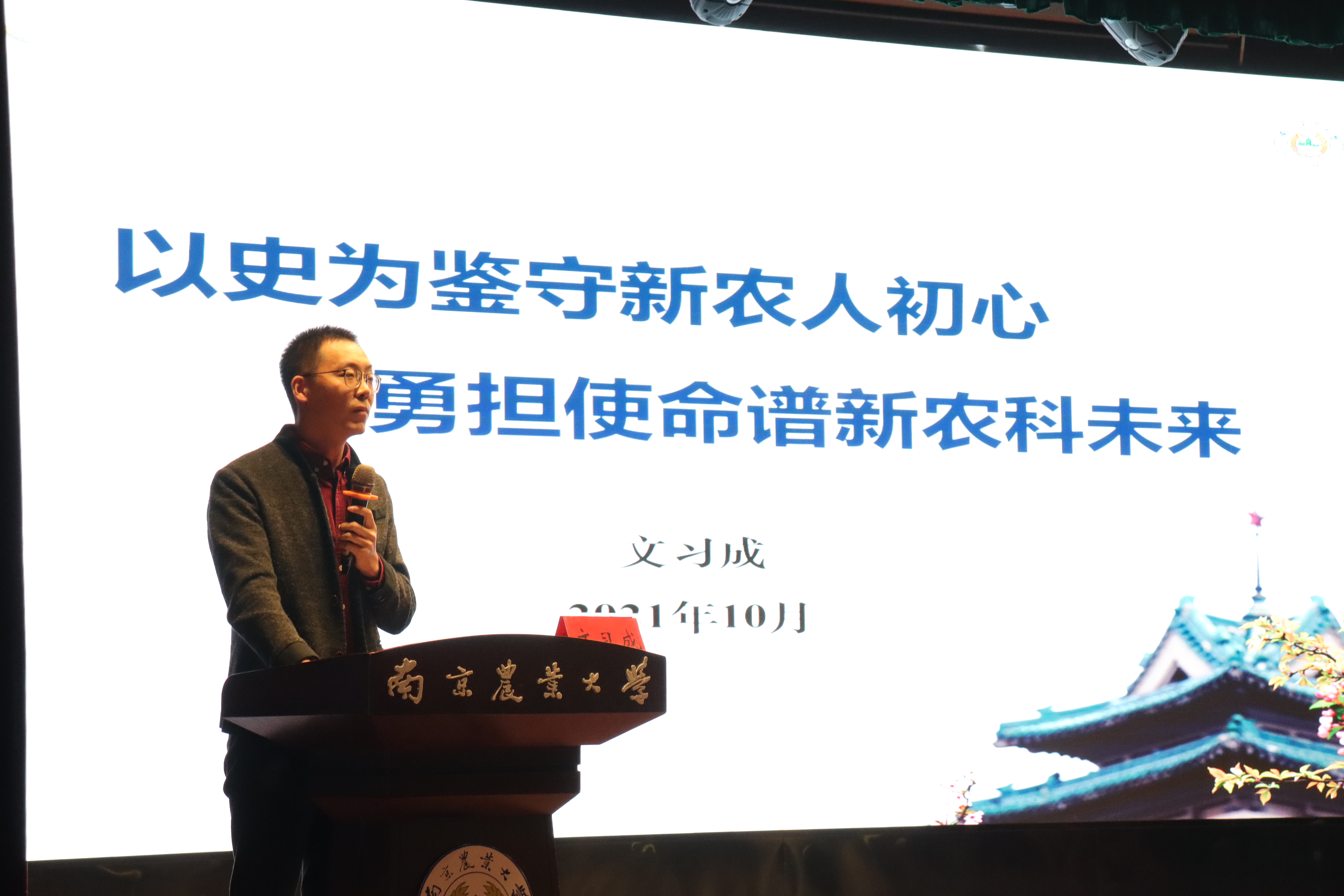 文习成围绕“以史为鉴守新农人初心,勇担使命谱新农未来”,通过“农民 农人 新农人”引出报告主题,通过中国农业发展经历的三个时期的典型人物事迹、历史重大成果等方面深入浅出地讲述中国发展大趋势,并分别从“南农人的贡献”“新农人的精神”“新农人的使命”三个方面引导我校学子勇担历史使命,传承和发扬诚朴勤仁的南农精神。