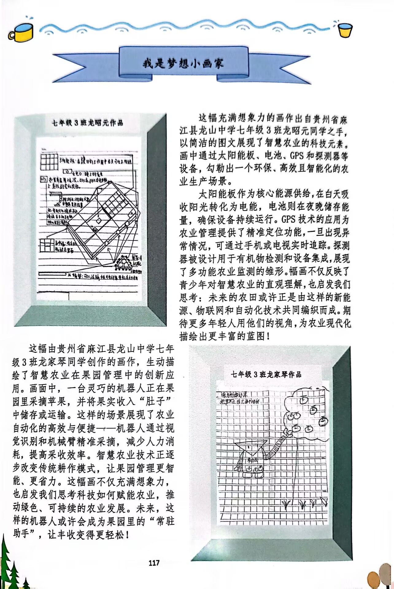 师生撰写的专业科普知识,在番外篇中,还展示了龙山中学同学们对于未来AI科技的畅想。其中,龙山中学七(3)班的龙昭元、龙家琴画出了他们想象中的机器人。