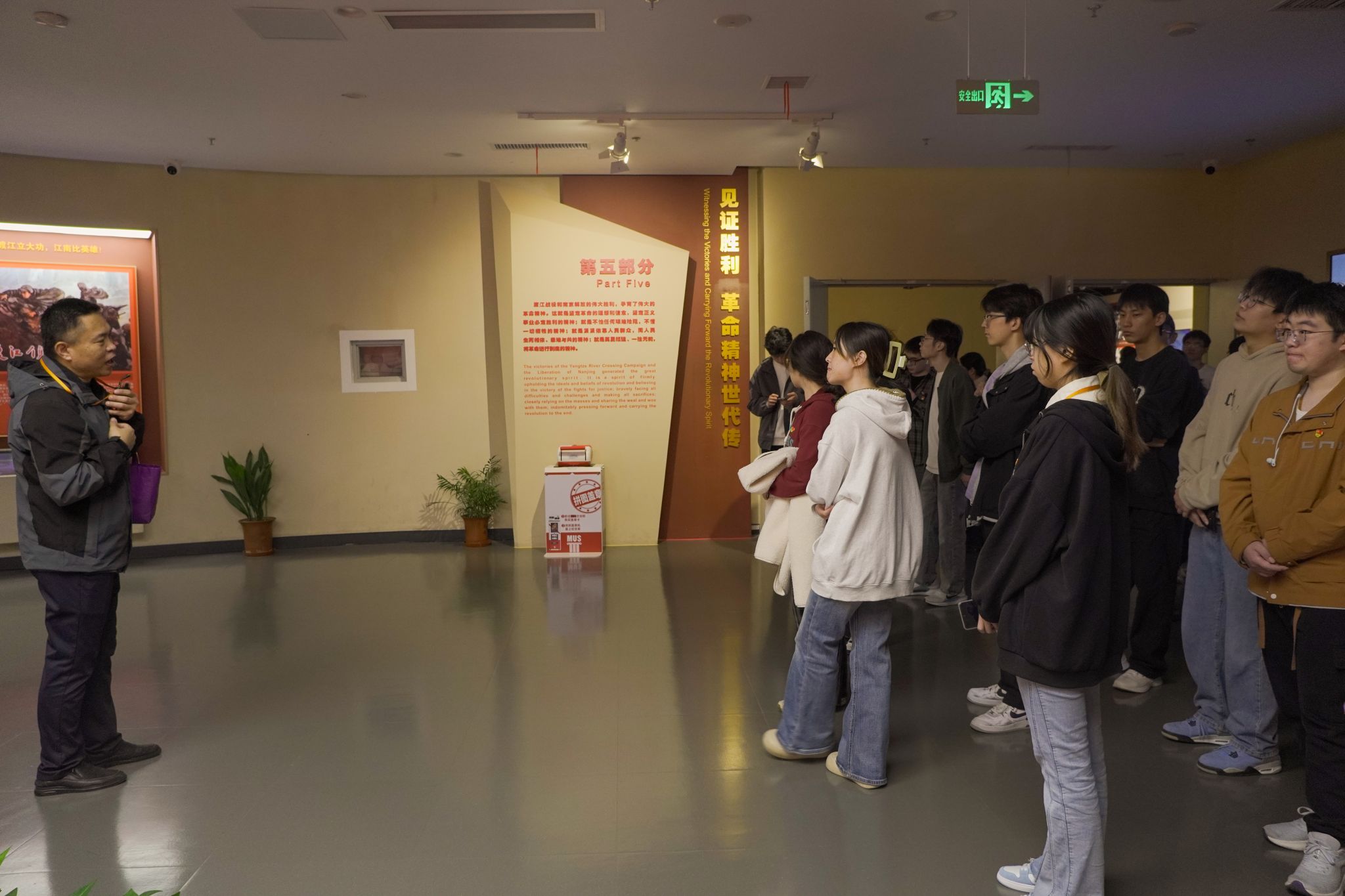 跟随讲解员的脚步步入馆内,巨大的浮雕在昏黄灯光下更显厚重感,珍贵的历史影像缓缓铺展。恍惚间,1949年那个改变民族命运的春天仿佛重现——耳边似有炮火轰鸣,“打过长江去,解放全中国”的震天口号更似在耳畔回响。面对厚重历史,全体同学神情肃穆,以无声的敬意缅怀为家国捐躯的革命先辈。