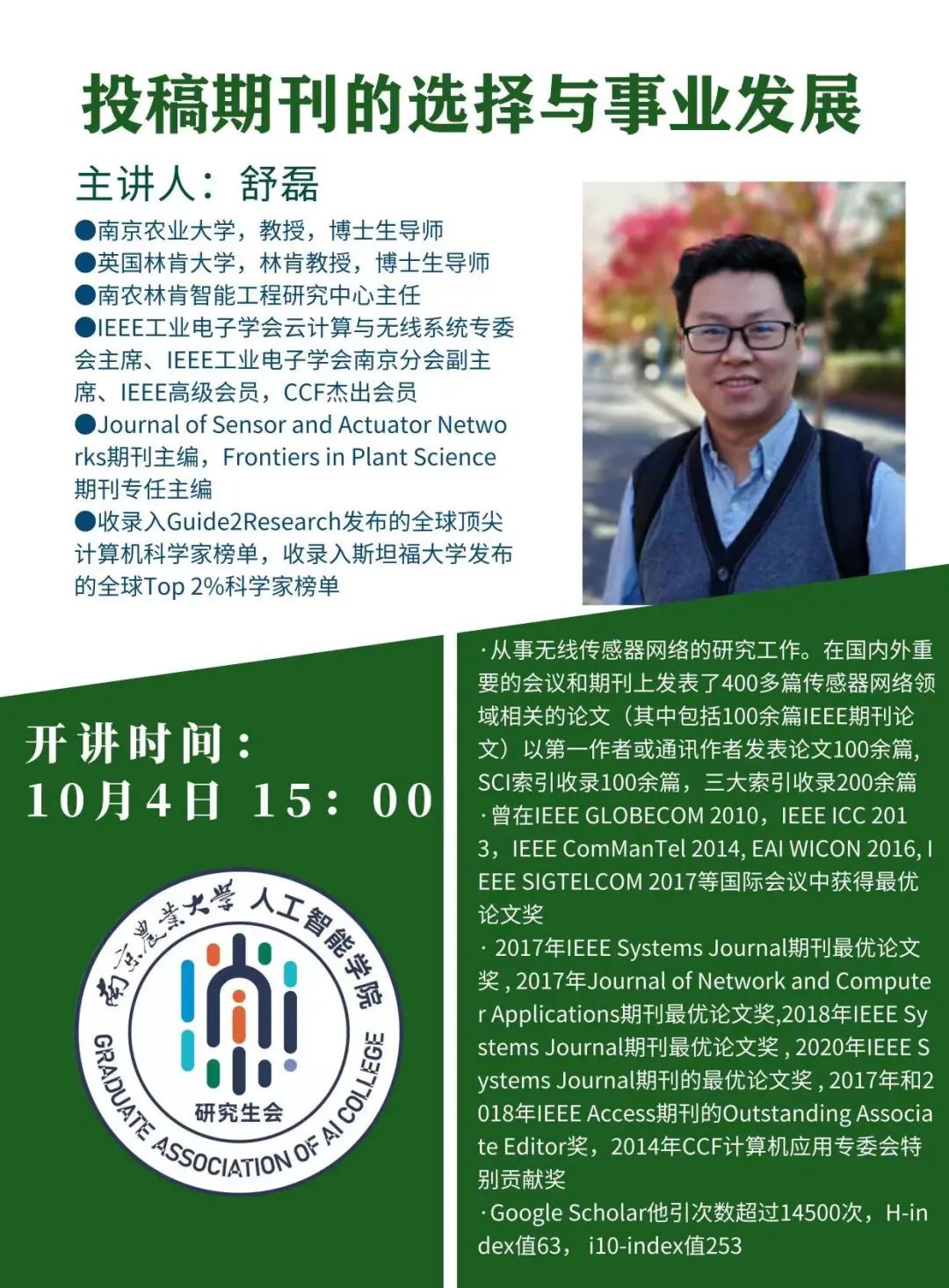 此外,舒教授还分享了IEEE协会现状和IEEE fellow获得的基本条件,列出了南京农业大学工科未来学术活动社区。
