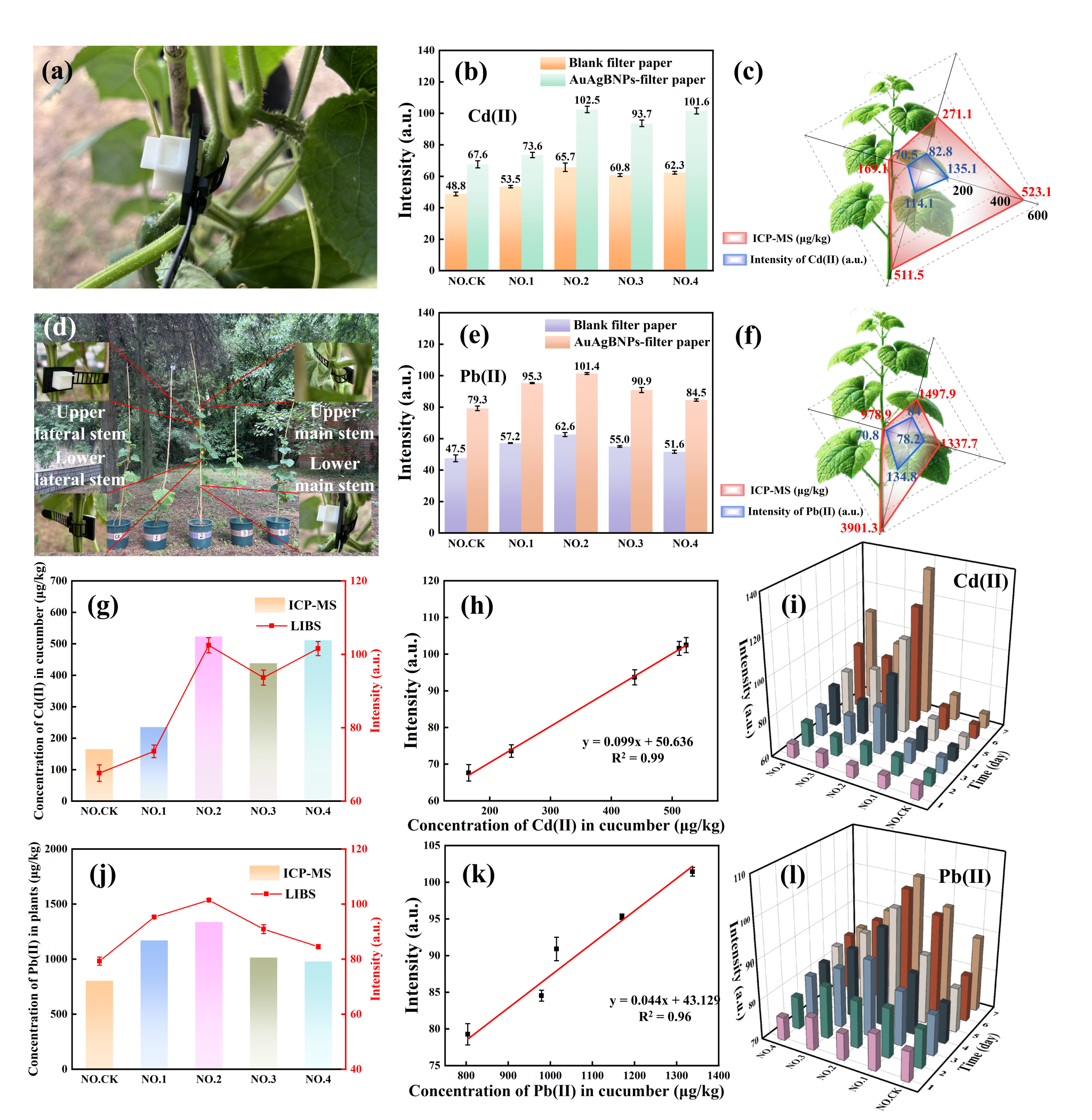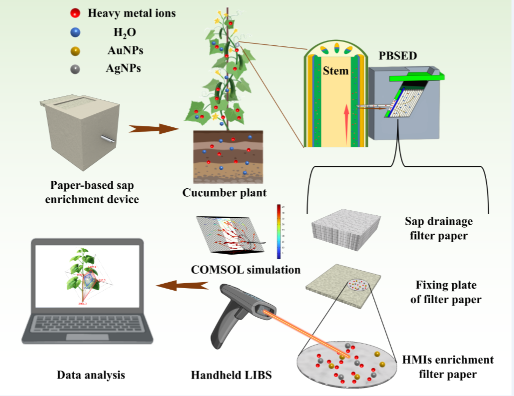 植物吸收镉和铅抑制光合作用、诱发氧化应激及DNA损伤破坏植物生理功能,并通过食物链富集危害农业生态安全与人类健康。在这项工作中,赵国副教授团队提出了一种快速、高灵敏度、现场、微创的植物重金属检测方法。该方法将LIBS与植物汁液纸基富集装置相结合,显著提高了检测灵敏度,使其适用于快速可靠的现场连续检测。为了进一步改进检测方法,引入了可视化分析,研究了植物汁液中的重金属在滤纸上的空间分布。此外,采用COMSOL仿真模拟植物汁液在纸基微流控通道中的流动动力学优化设计纸基汁液富集装置。通过对黄瓜植株的实际测试,精确测得汁液中重金属镉和铅的含量,并探究了重金属在黄瓜植株体内的空间分布规律以及重金属对植株的胁迫效应为作物胁迫机制解析与植株重金属现场检测提供了创新技术支撑。